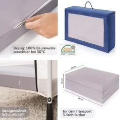 Met extra reismatras: Opvouwbaar matras van Alvi, 120x60x6 cm groot, met zijn eigen draagtas in de set inbegrepen.
