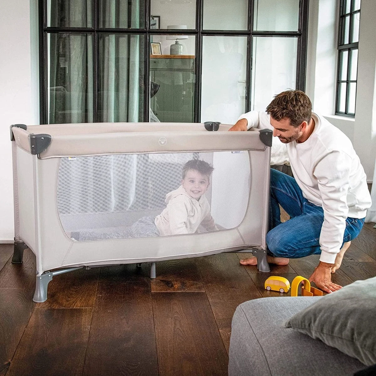 bestaande uit het Hauck Dream N Play campingbedje, een comfortmatras en een muggennet. Ideaal voor de volgende vakantie of bij grootouders of vrienden waar je kinderen af en toe overnachten. In een handomdraai is het bed op- en weer afgebouwd en in de bijgeleverde tas berg je het makkelijk op in de auto of in de kast.
